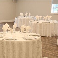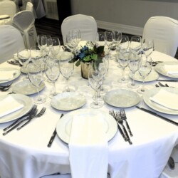 Dishware/glassware and table linens included with in-house catering by Chef Cos Catering.