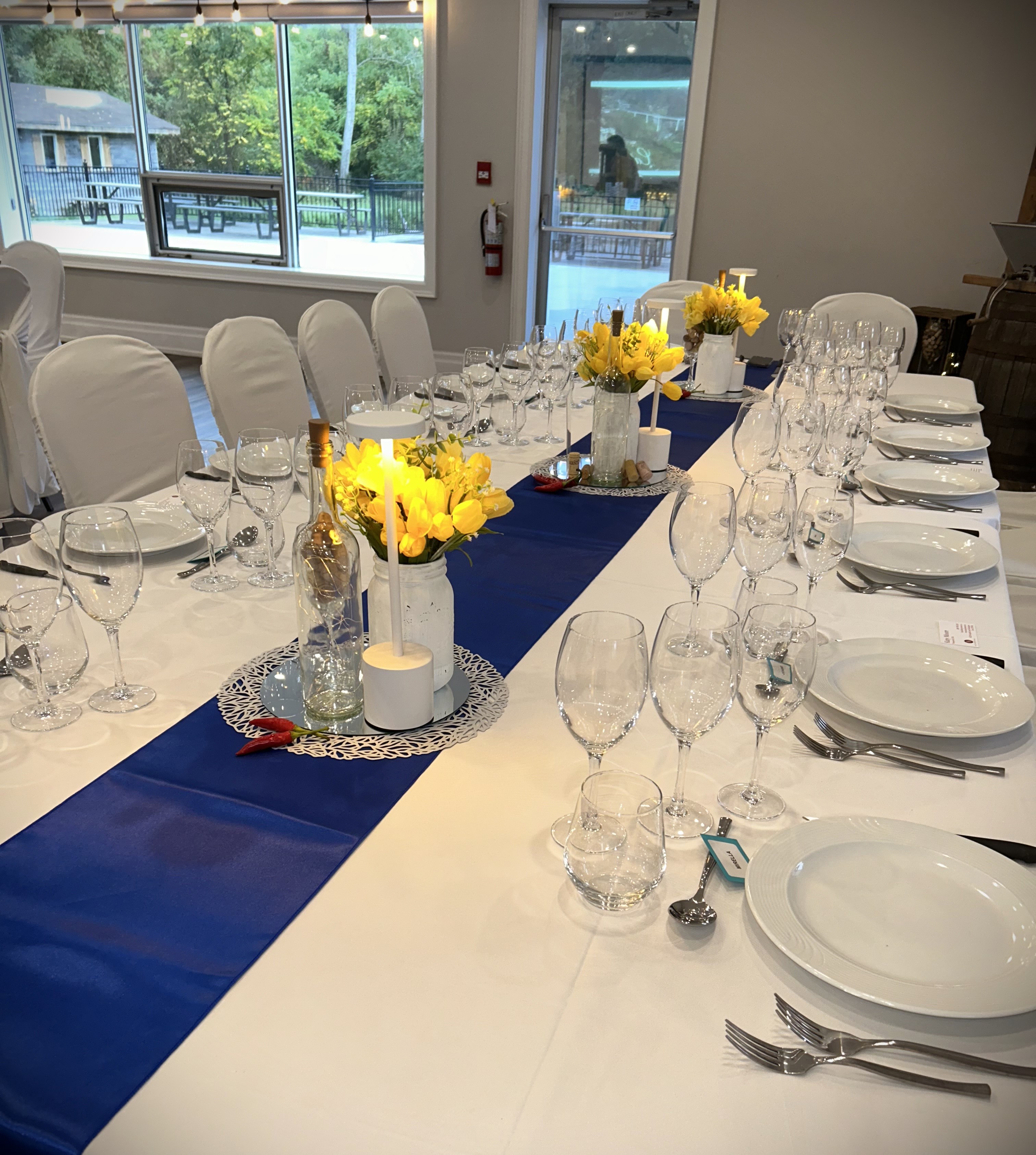 Dishware/glassware and table linens included with in-house catering by Chef Cos Catering.