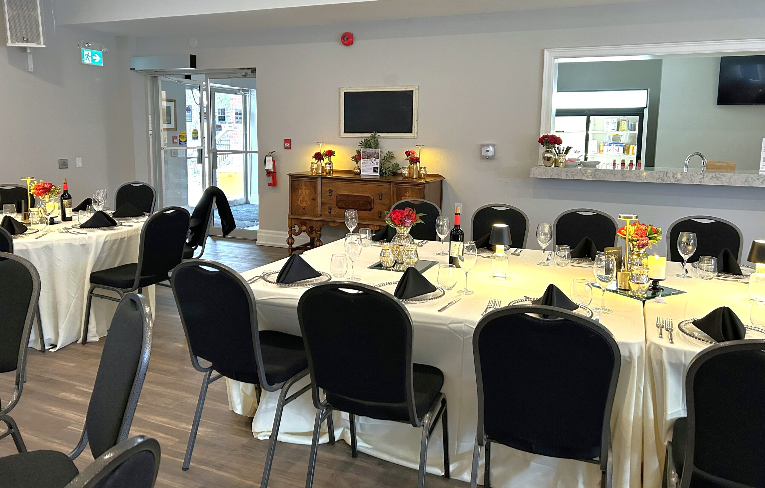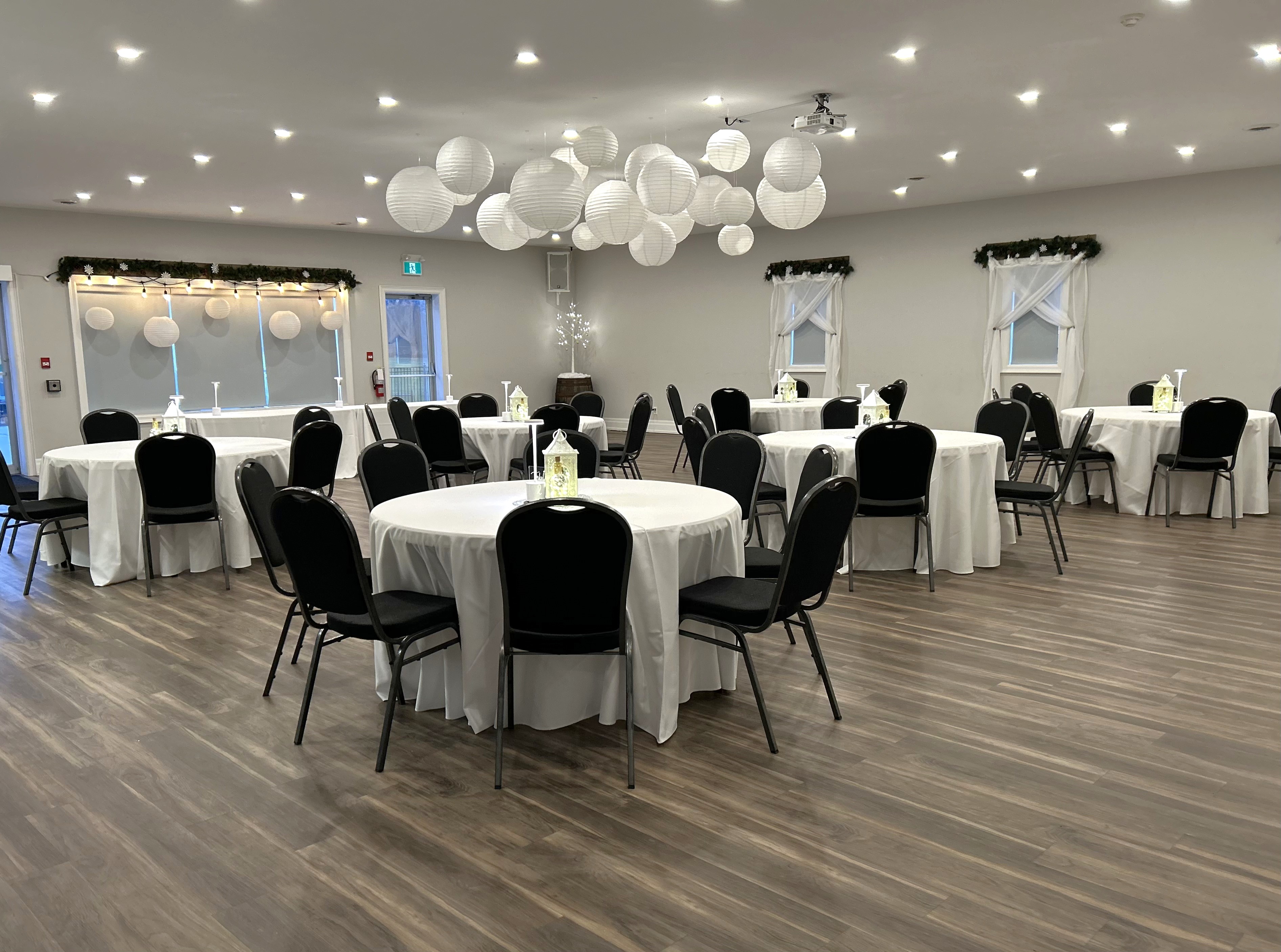 - Indoor banquet hall for 40 to 100 guests, including banquet tables and black banquet chairs.